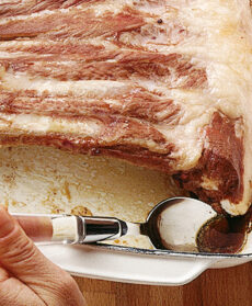 Eliminate poi quest’ultimo dal fondo della teglia e rimettete le puntine in forno, cuocendole per circa 45 minuti; bagnatele ogni 10 minuti con un po’ del vino della marinata filtrato.