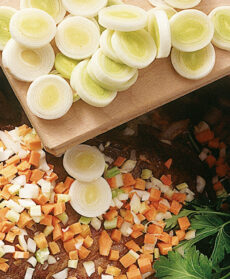 Aggiungete le verdure scolate dalla marinata e un mazzetto guarnito di erbe aromatiche (prezzemolo, alloro e timo) e cuocete per alcuni minuti. Versate quindi sopra la marinata, filtrata e possibilmente scaldare a parte, oppure il vino, il brodo o l’altro liquido scelto. Mettete dunque il coperchio e cuocete il brasato per circa 2 ore e mezza, a fiamma bassissima, controllando di tanto in tanto che il liquido non si asciughi e, nel caso, aggiungendone qualche mestolata calda.