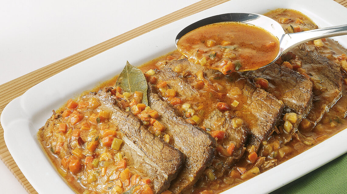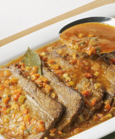 Gustoso secondo piatto a base di carne resa tenerissima dalla lunga cottura in un recipiente chiuso, il brasato di manzo è un grande classico della cucina della festa del Nord Italia. In particolare del Piemonte, dove il brasato al Barolo è una vera istituzione. Cotto in origine sulle braci, che venivano poste anche sopra il suo stesso coperchio, pare debba il suo nome proprio al termine “brasa”, che significa appunto brace. Accanto all’uso di una casseruola coperta, tra le sue caratteristiche distintive troviamo anche l’impiego di abbondante liquido, generalmente vino, che consente alla carne di cuocere in parte per immersione e in parte a vapore, assorbendone l’aroma. A fine cottura la polpa del brasato si presenta scura e quasi caramellata.