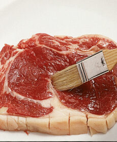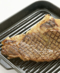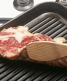 Adagiate la carne sulla piastra e scottatela a fuoco vivo per mezzo minuto. Quindi ruotatela di 90° e cuocetela ancora per mezzo minuto; poi giratela con una paletta e ripetete l’operazione.