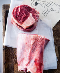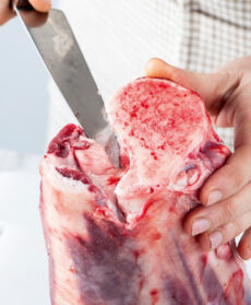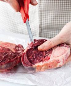 Tagliando a fette il geretto posteriore, il macellaio ricava degli ossibuchi con midollo che richiedono tempi di cottura più brevi. Prima di metterli in padella occorre inciderne i bordi per evitare che il calore li faccia “arricciare”.