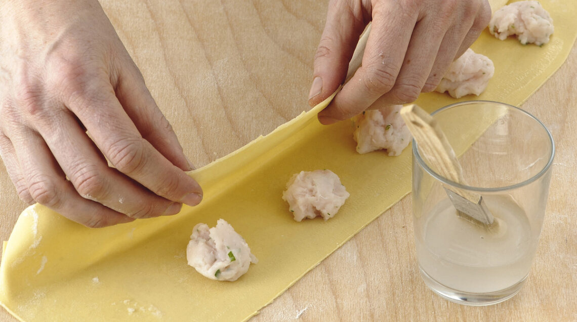 La stesura può avvenire al mattarello o, più facilmente, con l’apposita macchinetta: l’importante è che la pasta sia sottilissima altrimenti nei punti di chiusura, dove lo spessore raddoppia, potrebbe rimanere cruda. Se usate la macchinetta, dunque, dovete arrivare a passare la pasta tra i rulli avvicinati fino all’ultima tacca. Quale che sia la tecnica scelta, è importante lavorare (stendere, ritagliare e sigillare) poca pasta per volta: infatti, se la sfoglia resta troppo a lungo all’aria, si secca e i lembi non aderiranno bene. Per ovviare potrete passarli con un pennellino o un dito intinto in poca acqua.