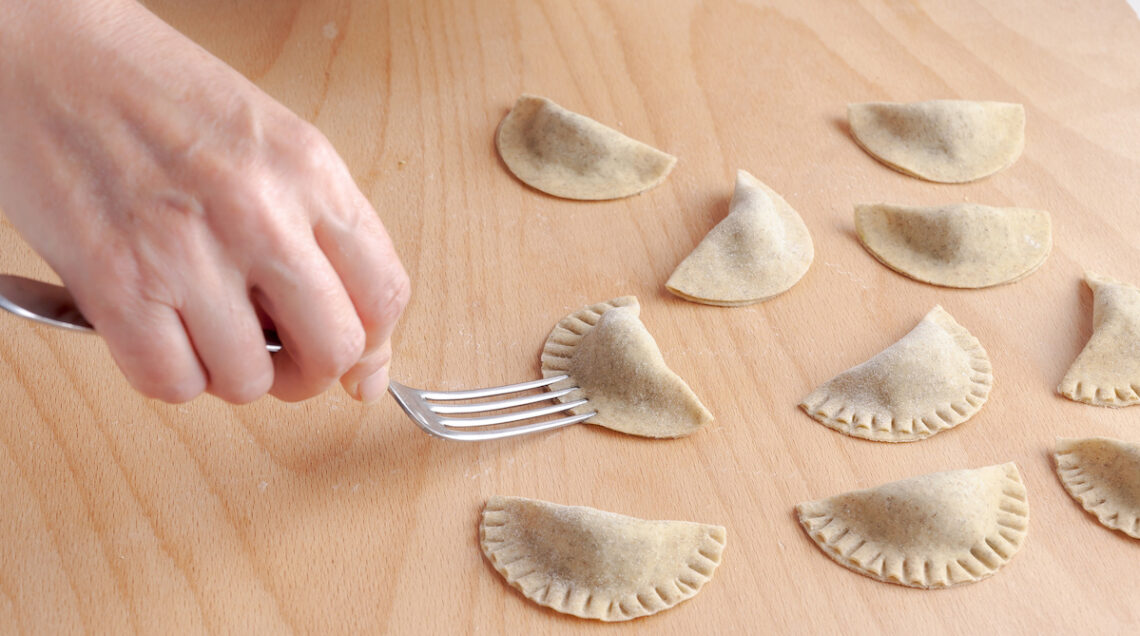 Un’altra tecnica, adatta soprattutto ai ravioloni più grandi, prevede di passare i bordi con i rebbi di una forchetta, schiacciando leggermente: la zigrinatura che se ne ottiene migliora ulteriormente la chiusura e la consistenza dei bordi dopo la cottura.