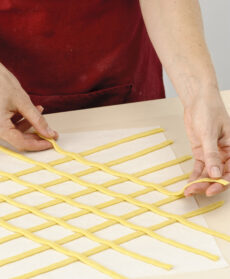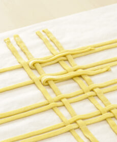 La ricetta della doppia griglia ti consente di realizzare un decoro alternativo per la tua crostata. Inizia rivestendo una tortiera rettangolare con uno strato di pasta frolla. Stendi dell’altra frolla fino a formare un rettangolo di pasta. Ricava dalla pasta 10 strisce della stessa lunghezza del lato corto della tortiera e altre 8 strisce della stessa lunghezza del lato lungo. Per creare la doppia griglia sistema su una placca da forno metà delle strisce lunghe, assicurandoti che siano a una distanza di 4-5 cm l’una dall’altra.