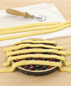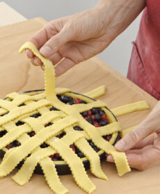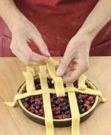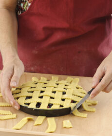 Fodera con un disco di pasta frolla uno stampo a bordi bassi imburrato e infarinato e farciscilo con il ripieno scelto (noi abbiamo farcito con frutti di bosco surgelati saltati con poco burro e zucchero). Con una rotella dentata ricava da un rettangolo di frolla una decina di strisce larghe circa un cm e mezzo e un po' più lunghe del diametro dello stampo; sistema sulla crostata metà delle strisce parallele, alla distanza di un paio di cm una dall'altra.