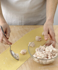 Sistema una striscia di sfoglia sulla spianatoia infarinata e distribuiscici sopra con un cucchiaio una fila di mucchietti di ripieno a scelta (nella foto il ripieno di pesce, vedi sotto); tieni la distanza di circa 3 cm dal bordo inferiore della sfoglia e di circa 4-5 cm tra un mucchietto e l'altro.
