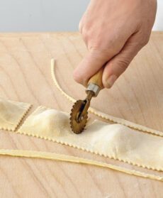Rifila la striscia di ravioli con una rotella dentellata poi, usando la stessa rotella, dividili.
