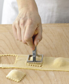 Puoi ritagliare i ravioli anche utilizzando uno stampino quadrato a bordi dentellati, che avrai prima leggermente infarinato per evitare che si attacchi alla sfoglia.