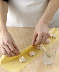 Inumidisci i bordi della sfoglia con un pennello bagnato in acqua fredda e ripiegala sul ripieno; premi tutt'intorno a ogni mucchietto con le dita in modo da eliminare i vuoti d'aria, poi sigilla le due sfoglie.