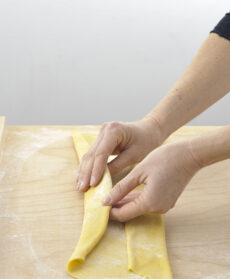 Per realizzare le tagliatelle, sistemate la sfoglia sulla spianatoia infarinata e infarinatene leggermente anche la superficie, poi portate i lembi opposti verso l’interno per 3-4 cm.