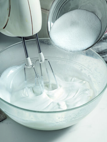 Zucchero a velo: la grana ultrafine ne facilita l’assorbimento nel composto di albumi. Va comunque incorporato alla fine, quando gli albumi sono ben montati, facendolo scendere a pioggia da un setaccio a maglie fini e mescolando poi con una spatola con movimenti dal basso verso l’alto per amalgamarlo senza smontare il composto.