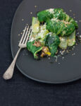 Tra le preparazioni di pasta ne troviamo una che potrebbe essere facilmente confusa con un risotto. Sono i risoni con crema di spinaci, asparagi e bietole della foto sopra, risottati e mantecati con l’aggiunta di formaggi. Da provare anche queste ricche lasagne con nocciole e speck, sempre realizzate con le erbette, così come i fusilli di farro con crema di lenticchie e la torretta di pasta fillo, entrambe a base di coste. Tornando alle erbette, potrete unirle agli spinaci per cucinare questi saporitissimi gnocchi con zola e nocciole.