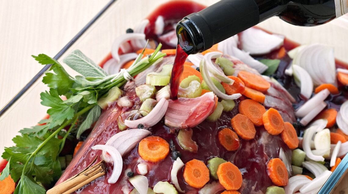 Versate il vino sulla carne, ricoprendovela completamente, poi sigillate il recipiente con un foglio di pellicola per alimenti. Lasciate insaporire la carne per 10-12 ore in frigo. Trascorso il tempo indicato, riprendete la carne, scolatela dalla marinata e asciugatela tamponandola con carta da cucina. Recuperate dal vino anche gli ortaggi, mentre per quanto riguarda il liquido potrete sia filtrarlo e utilizzarlo in cottura sia scartarlo e sostituirlo con altro vino.