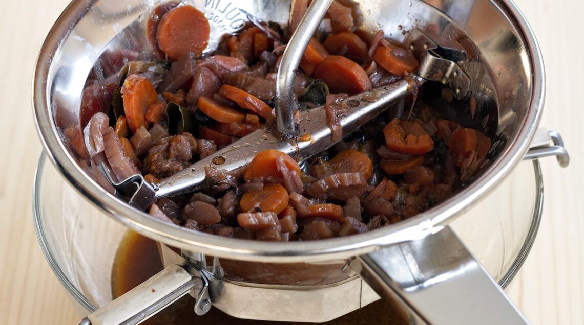 Trascorso il tempo indicato, togliete il coperchio e regolate di sale e pepe, quindi proseguite la cottura per un’altra ora circa, bagnando se serve con altro brodo caldo. Togliete infine la carne dalla casseruola, sgocciolate le verdure e frullatele o passatele con un passaverdure. Ponete nuovamente carne e verdure nella casseruola e irroratele con altro vino caldo. Cuocete ancora per 10 minuti, poi spegnete il fuoco e lasciate riposare il brasato per 30 minuti prima di servirlo tagliato a fette e irrorato con il sugo.