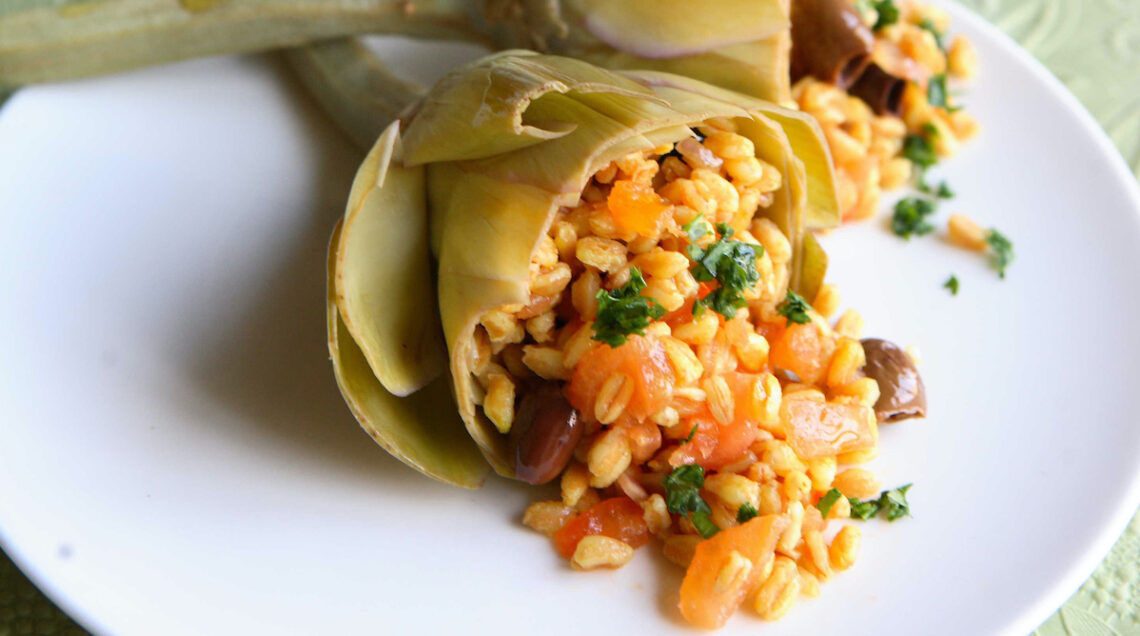 La versatilità del farro consente di usare questo cereale anche nei ripieni di torte salate e verdure, come faremmo con il riso. Nel primo caso avremo una portata come questa torta salata in verde, dove il farro lessato si mescola alle erbe selvatiche e la ricotta per trovare posto tra più strati di pasta fillo o dei raffinati tortini di alici. Tra gli ortaggi farciti troviamo questi pomodori al forno, da gustare freddi e quindi ottimi anche per un leggero pasto estivo o i carciofi allo zafferano della foto.