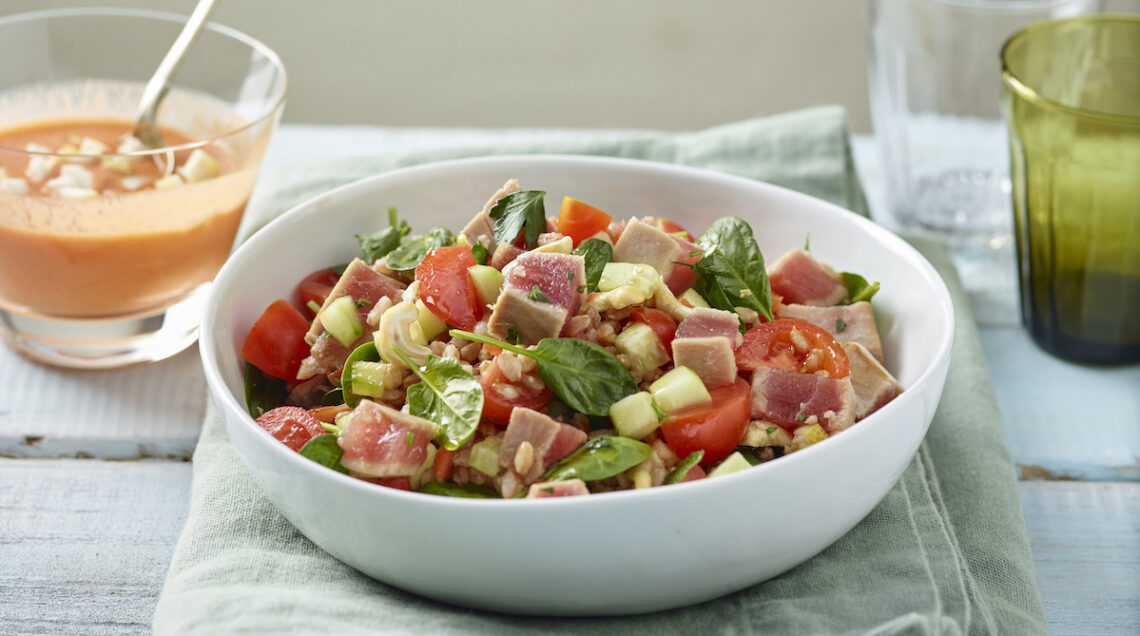 Passando all’incontro con i prodotti di mare va ricordata la delicata insalata con tonno fresco in salsa di limone e pomodoro (nella foto), la raffinata insalatina con polpo e vongole o un leggero piatto unico speziato come il farro con fagioli dell’occhio e mazzancolle.