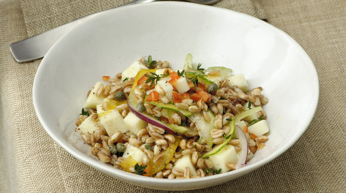Dalla consistenza morbida e soda insieme, una volta bollito il chicco del farro è adatto a sostituire quello del riso in numerose insalate e primi asciutti. Ottimo è ad esempio l’abbinamento con i formaggi come nel mix al pecorino della foto in alto, preparato accostando il cereale lessato al latticino fresco con capperi e verdure affettate fini, questa insalata tiepida alla feta arricchita con ortaggi di primavera, questa con verdure e montasio o, ancora, quelle con primosale e mandorle o con rucola e gorgonzola.