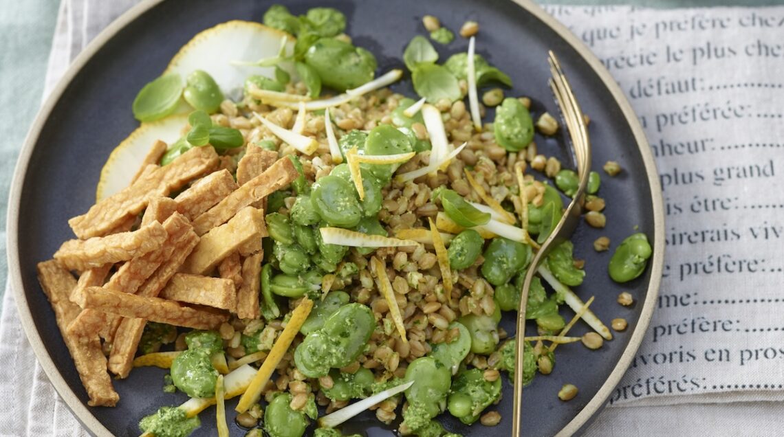 Molto più semplice da cuocere è il tempeh fritto che accompagna l’insalata di farro monococco con fave e cedro della foto sopra. Tagliato semplicemente a bastoncini, è stato fritto in olio di semi di arachidi aromatizzato con aghetti di rosmarino. Da servire con il cereale lessato e condito con una salsina a base di prezzemolo, semi di zucca e aglio.