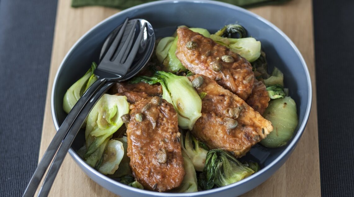 La cottura del tempeh in padella dà origine a tantissimi piatti molto diversi tra loro. Tutto sta nel diverso modo di condire e accompagnare la “carne di soia”. Nella scaloppine di tempeh con bok choi saltato al miso della foto sopra l’ingrediente base è stato tagliato a fette e quindi lasciato riposare per 20 minuti in una ciotola con cipolla affettata finemente, timo, salvia, paprica, aceto, aglio e acqua. Scolate e infarinate, le fettine sono poi state saltate in padella con un filo di olio e quindi glassate con la loro stessa marinata unita a succo di limone e capperi. Il tempeh con tagliolini in salsa verde è invece stato prima cotto a vapore, poi marinato in un mix di prezzemolo, coriandolo, aglio, peperoncino, olio e acqua mescolato con salsa tamari e infine tostato in una padella antiaderente.