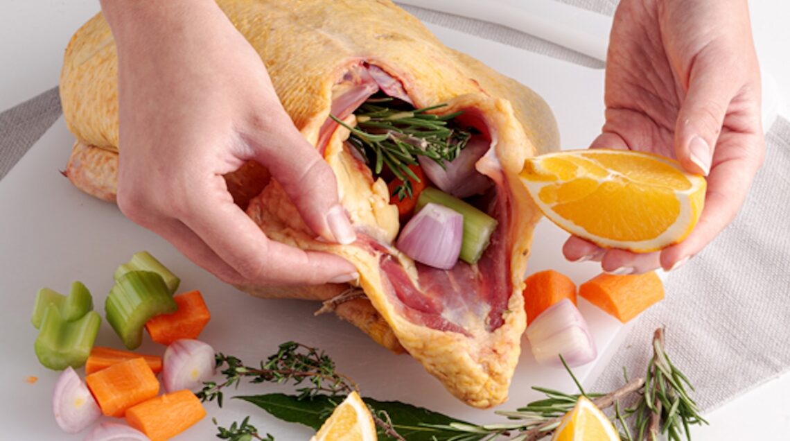 L’anatra all’arancia può avere un ripieno più o meno ricco, così come non averlo del tutto. Nel caso decidiate di farcirla, potrete condirla internamente con sale e pepe e quindi inserirvi tocchetti di carota, sedano e scalogno con alcune fette di arancia e rametti di erbe aromatiche, dal rosmarino al timo e l’alloro.