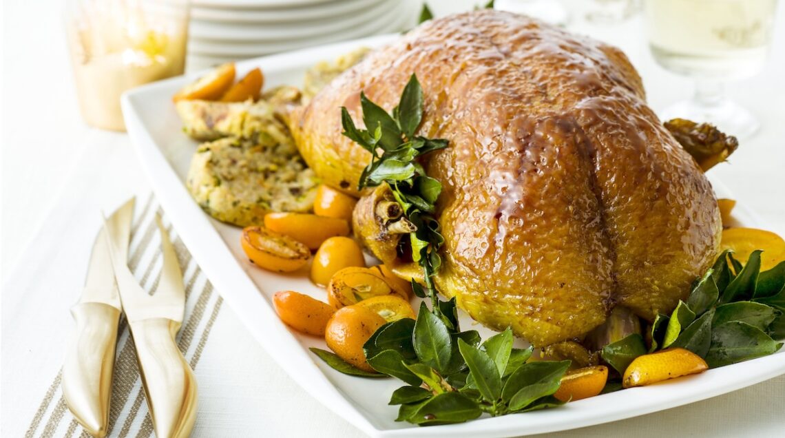 Lo stesso vale per l’anatra farcita con kumquat e pistacchi di questa foto. Per prepararla, amalgamate 100 g riso bollito con una fetta di pancarrè sbriciolato, 150 g di trita di vitello, un uovo, parmigiano grattugiato, 8 kumquat a pezzettini, 60 g di pistacchi e una manciata di prezzemolo tritato. Regolate di sale e pepe, poi farcitevi l’anatra pulita e condita. Cuocetela quindi per un’ora abbondante, nel forno caldo a 200° e poi abbassato, dopo aver spruzzato la carne di brandy, a 180°. Unite altri mandarini cinesi negli ultimi 30 minuti di cottura, insieme a sale e pepe.