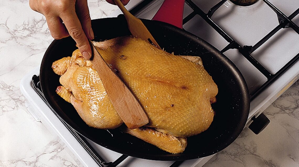 La ricetta base dell’anatra all’arancia prevede che il volatile sia cucinato intero al forno. Direttamente in teglia o dopo una prima rosolatura sul fuoco. In questo caso, vi basterà insaporire l’anatra pulita con sale e pepe, dentro e fuori, e farla poi dorare rigirandola per qualche minuto a fiamma viva in una casseruola o una larga padella con olio e burro.