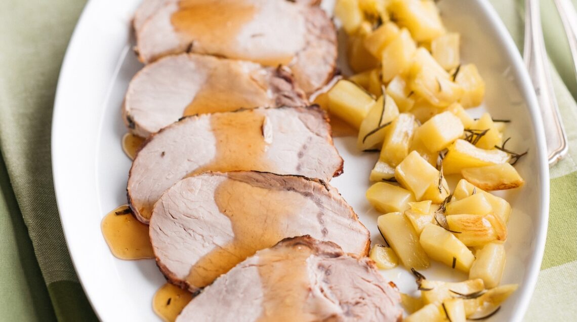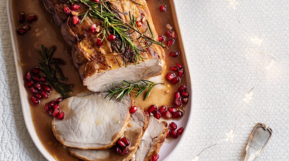 Torna anche con la carne suina il frutto portafortuna nell’arrosto di maiale alla melagrana della foto sopra, cotto in forno con l’aggiunta del succo ottenuto dal frutto sgranato, così come gioca con i sapori dolci il filetto di maiale arrosto glassato alla senape di Digione.