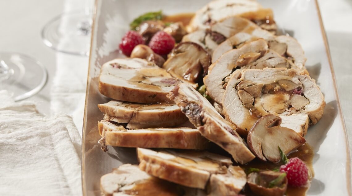 Per finire, tre esempi, tra i tanti, di arrosti arrotolati. Sono tutti preparati a partire dalla fesa di tacchino, adeguatamente farcita, avvolta su se stessa e quindi messa in pentola o in teglia con gli aromi e i contorni più diversi. Nel caso dell’arrosto di tacchino con funghi e lamponi della foto sopra la carne è arricchita da porcini e frutti di bosco e quindi cotta sul fuoco con l’aggiunta di vino bianco e brodo.