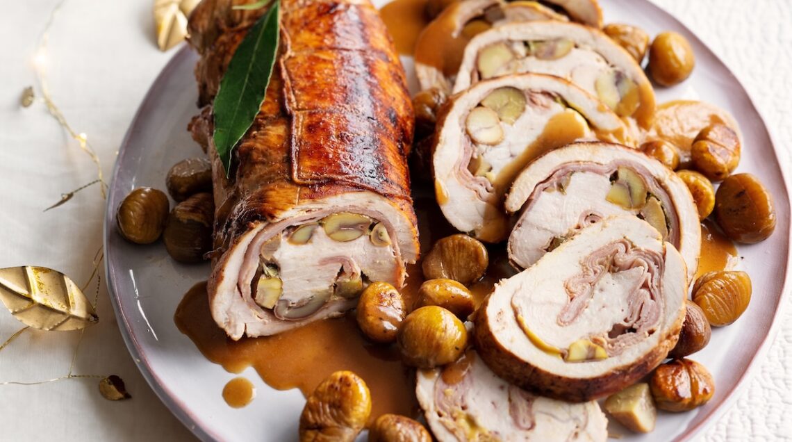 L’arrosto di tacchino alla birra guadagna invece al suo interno castagne, porri e cranberries, mentre sono sempre le castagne, ma questa volta unite al prosciutto affumicato, a rendere irresistibile l’arrosto di tacchino alla senape della foto sopra.