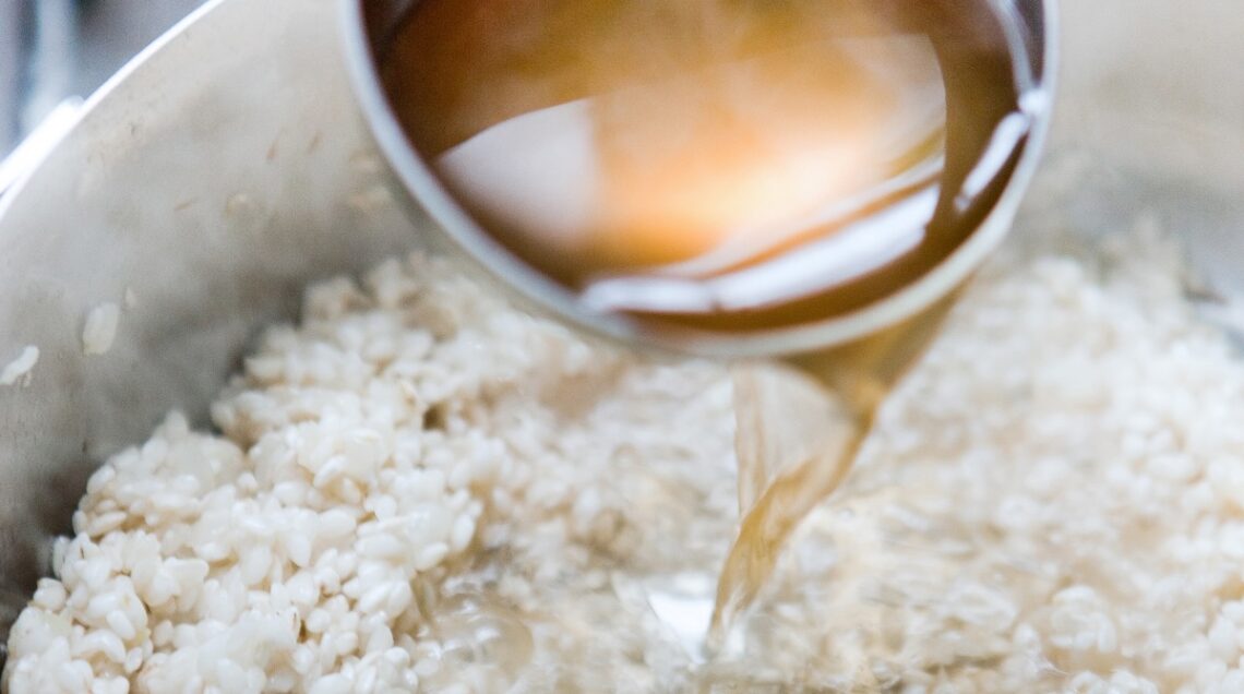 Versate dunque una mestolata di brodo, possibilmente di carne e scaldato a parte, mescolate con un mestolo di legno e lasciate assorbire il liquido completamente prima di aggiungerne dell’altro. Sempre a mestolate e sempre bollente. Non mescolate troppo, limitandovi al minimo indispensabile per non fare attaccare il riso al fondo del tegame.