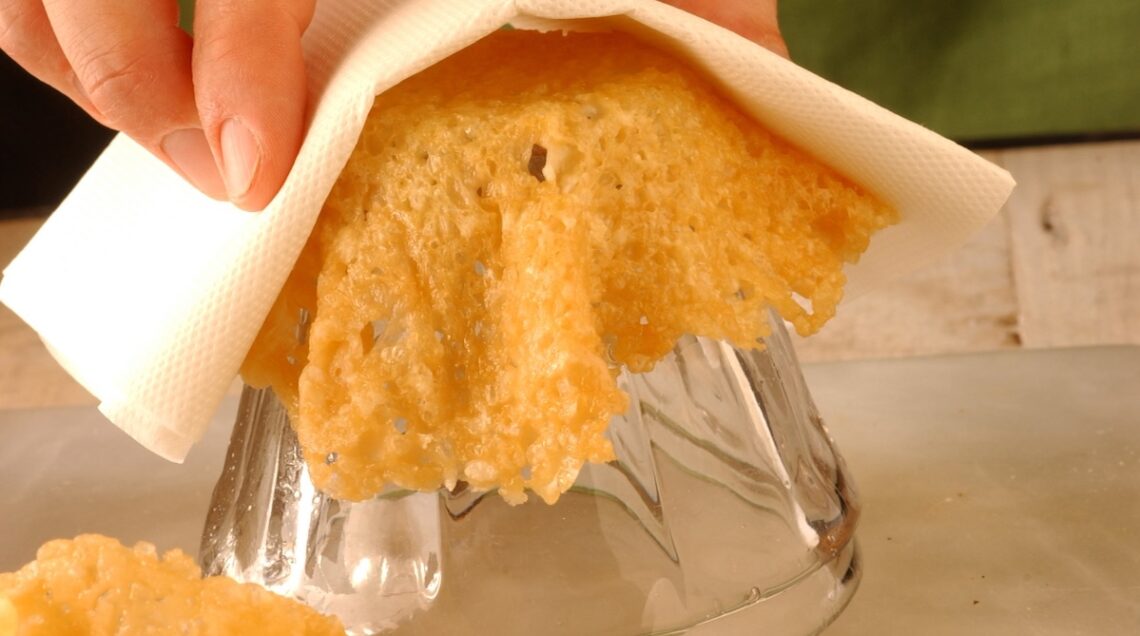Tolta dalla padella, modellate la cialda ancora morbida posandola sul fondo di un bicchiere o di una ciotola, a seconda delle dimensioni e della quantità di cibo che volete servirvi dentro. Quando si sarà solidificata potrete riempirla con il risotto e servirlo.