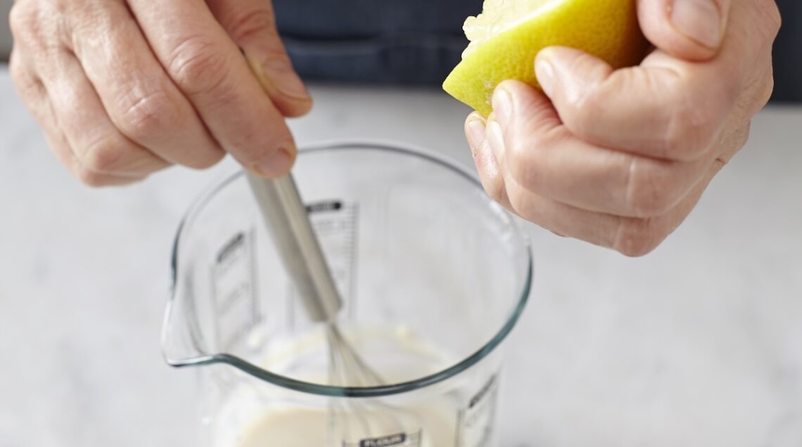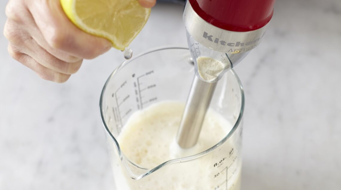 Iniziate a incorporare dai 4 ai 6 cucchiai di olio di semi di mais, poco alla volta e versandolo a filo, sempre lavorando con il frullatore a immersione fino a quando tutto l’olio sarà assorbito. Una volta che avrete ottenuto una consistenza omogenea e cremosa, unite mezzo cucchiaino di sale e, sempre continuando a frullare, 2 cucchiai di succo limone. Conservate coperto in frigo per 4-5 giorni.
