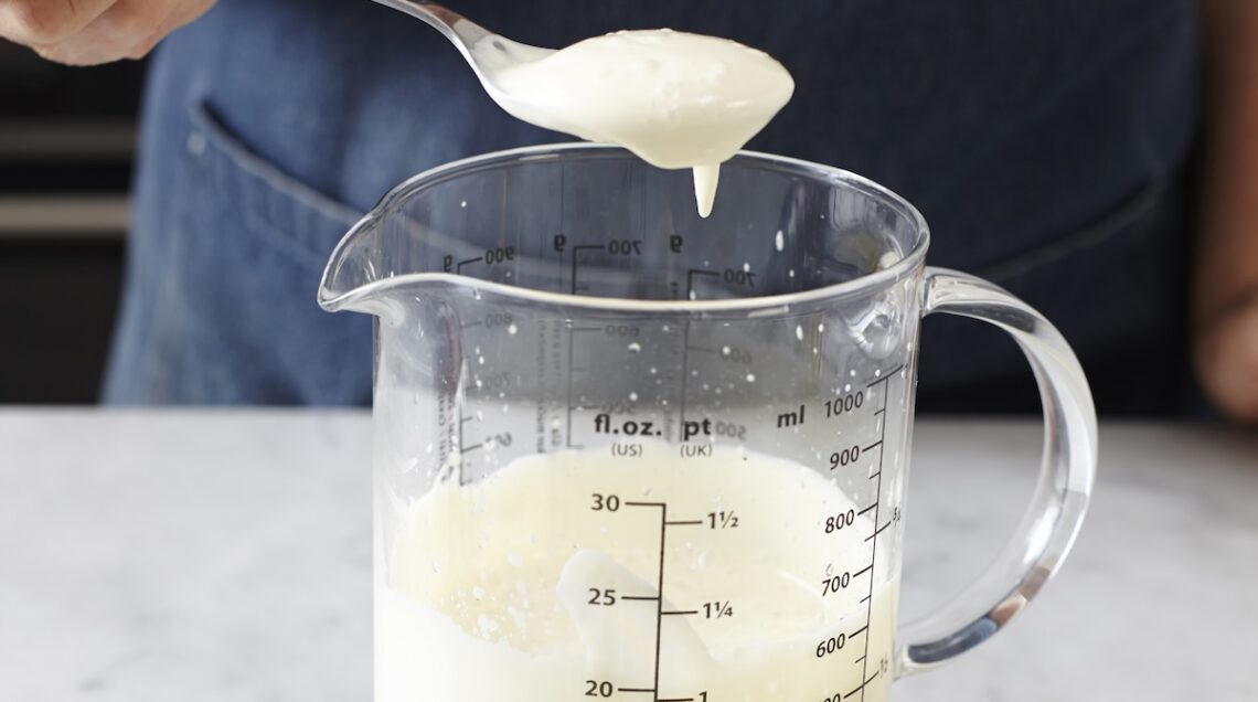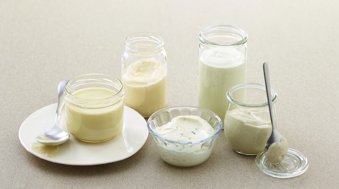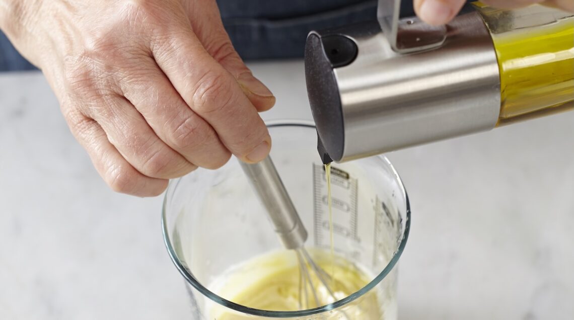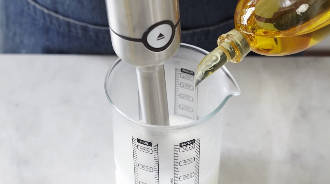Tra tutte le varianti di maionese senza uova, questa è l’unica non vegana, dato che impiega il latte di mucca. Per prepararne una tazza, versate in un bicchiere graduato 80 ml di latte intero ben freddo, appena tolto dal frigo. Frullatelo quindi con un frullatore a immersione fino a quando comincia a fare schiuma, poi iniziate a unire a filo 90 ml di olio di semi di mais, poco alla volta e a filo, alternandolo con 90 ml di olio extravergine d’oliva, a sua volta versato a filo e sempre continuando a emulsionare il composto.