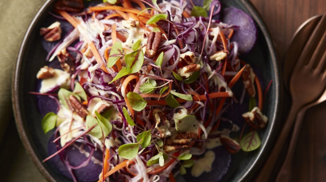 La maionese vegetale sarà poi perfetta nel condire le insalate. Di verdure sia crude sia cotte, sia fredde sia tiepide. Perfetta per la tavola della festa grazie ai suoi colori vivaci e sapori intensi, la capricciosa di Natale con patate viola della foto sopra unisce i tuberi lessati e tagliati a fette a carote a julienne e cappuccio bianco rosso finemente affettati. Per condirla, potrete sostituire la maionese tradizionale con una sua alternativa veg e mescolarla come richiesto con aceto di mele, sciroppo d’acero e senape.