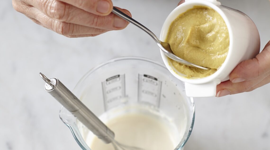 Unite a questo punto anche un cucchiaino di senape e mescolate con cura, sempre sbattendo con la frusta a mano fino a ottenere una crema liscia e omogenea.