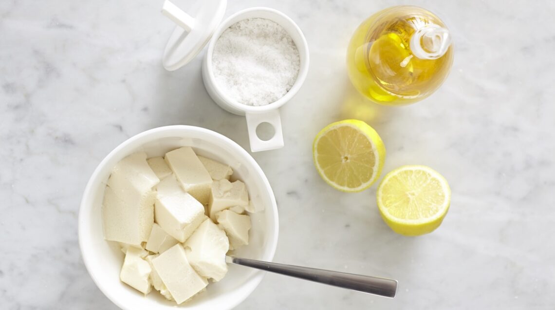 Tagliate a pezzi 360 g di tofu morbido (silken) e lasciatelo riposare in un colino fine per circa 10 minuti circa, in modo che perda l’acqua in eccesso. Trasferitelo quindi in un bicchiere graduato e cominciate a lavorarlo con un frullatore a immersione per renderlo cremoso.