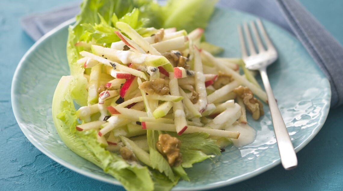 La nuova insalata Waldorf che vedete nella foto sopra rielabora una ricetta nata a New York nel 1893 che aveva alla sua base sedano rapa e mela in parti uguali conditi con maionese. Nel piatto qui proposto compaiono anche noci, lattuga e tartufo e il tutto viene condito con crème fraiche, yogurt, succo di limone, olio, sale e pepe. Recuperando la tradizione, potrete sostituire il composto indicato con una maionese al latte vaccino o di soia. Potrete infine muovervi in modo simile anche con questa insalata di mele, sedano e nocciole. Se il concetto di base non si discosta troppo dalla Waldorf, anche qui nel condimento potrete sostituire la maionese consigliata con una sua sostituita senza uova. E, mescolandola con senape, panna montata e ketchup, condirvi ortaggi e frutta.