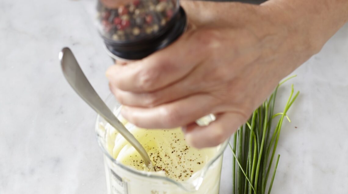Quando la maionese avrà iniziato ad assumere una consistenza cremosa, unitevi 1-2 cucchiaini di succo di limone, sempre frullando. Completate infine con una macinata di pepe misto, un mazzetto di erba cipollina tagliuzzata fine e una presa di sale. Potrete conservare questa maionese in frigo per 3-4 giorni.