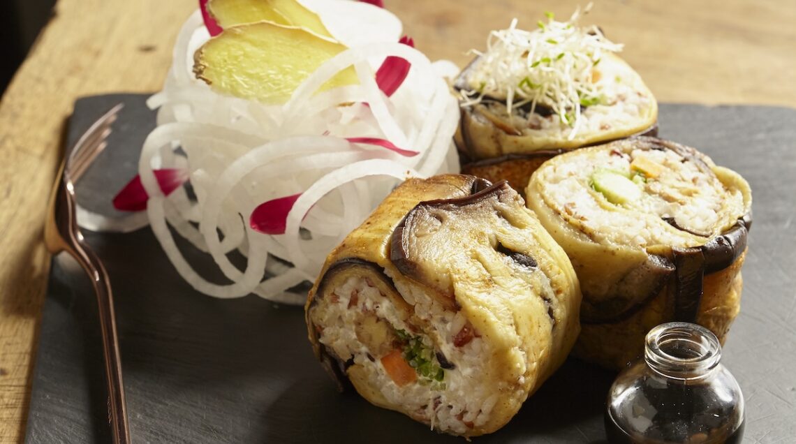 La maionese che accompagna il kebab di seitan e cipolle di questa foto è invece preparata con il latte di soia. La diffusa bevanda vegetale è stata qui frullata con l’olio e un pizzico di sale e poi completata con un trito di erba cipollina. Restiamo nell’ambito della cucina esotica, ma ci spostiamo più a est con il sushi di melanzane e tempeh (foto sotto). La versione veg della classica preparazione giapponese si fa forte, tra gli altri, della salsa che viene spalmata sul riso che compone i rotolini. La maionese vegetale è stata preparata frullando il latte di soia con olio d’oliva, di mais, wasabi e succo di limone, guadagnando così un gusto piacevolmente pungente.