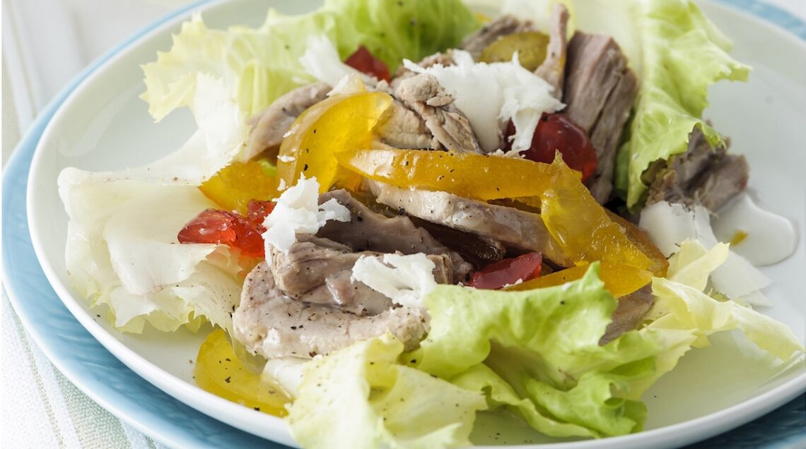 Il magatello protagonista di questo bollito con mostarda di peperoni e mosto cotto è invece servito con gli ortaggi rosolati in padella con la cipolla e quindi cotti a fuoco lento con l’aggiunta di mosto ed essenza di senape. Per finire, il reale di manzo protagonista di questa insalata di bollito con mostarda, è stato fatto raffreddare immerso nel suo brodo e quindi spolpato. Tagliato a filettini, incontra la scarola fresca e un classico accompagnamento del bollito quale la mostarda.