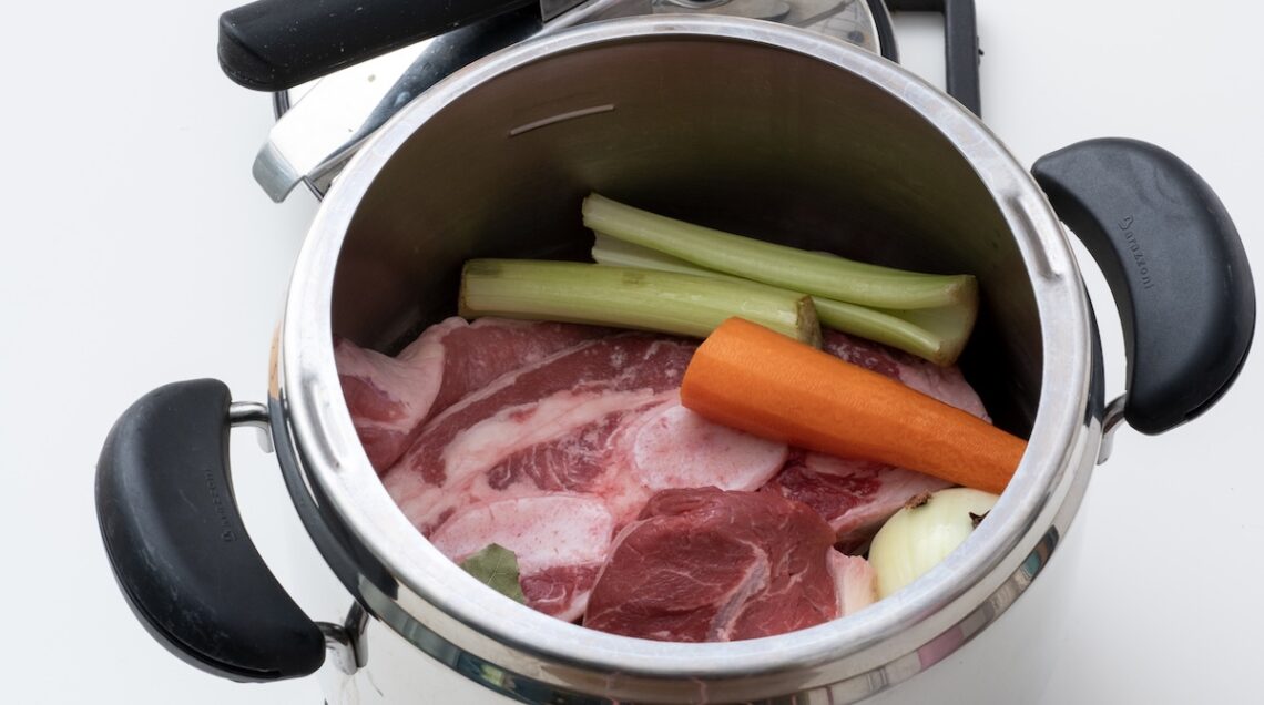 Per preparare il bollito nella pentola a pressione tagliate la carne a pezzi e fateli rosolare nella pentola con un filo di olio extravergine d'oliva. Aggiungete quindi le verdure (carote, cipolla, sedano) pulite, sbucciate e tagliate grossolanamente. Regolate quindi di sale e pepe, poi versate un litro di acqua e chiudete il coperchio.