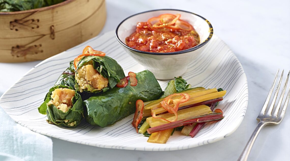 Non mancano ovviamente anche le preparazioni a base esclusiva di vegetali o, comunque, senza carne né pesce. Gli involtini di bietole con miglio e patata dolce della foto sopra utilizzano le foglie delle coste sbollentate per avvolgere un gustoso ripieno e poi cuocere il tutto a vapore. Queste foglie ripiene, invece, puntano sulla cottura in padella e chiudono la parte verde delle bietole da costa intorno a un composto di grano saraceno bollito e rosolato in un mix aromatico.