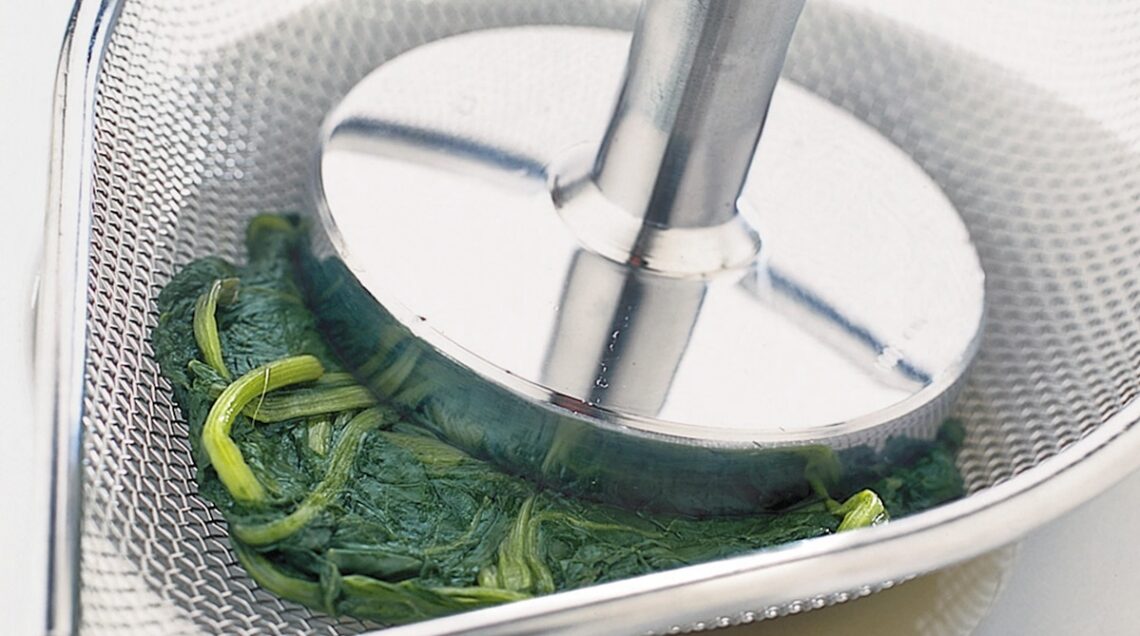 Dopo averle scottate e scolate, strizzate le foglie per privarle dell’acqua in esse contenuta, dal gusto amaro. Potrete svolgere questa operazione con le mani o, per eliminare quanto più liquido possibile, utilizzando un colino e un batticarne come mostrato nella foto sopra.