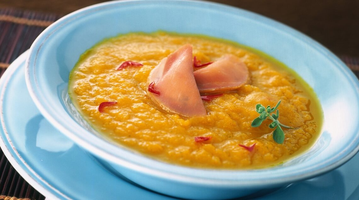 Tra i primi piatti ricordiamo in particolare quelli in brodo. Avremo così sia piatti vellutati come la crema di carote con mezzelune di prosciutto (foto sopra) con gli ortaggi bolliti con le spezie e poi frullati, sia portate più rustiche quali la minestra in arancione con carote e zucca, piatto facile quanto rassicurante preparato con il riso.