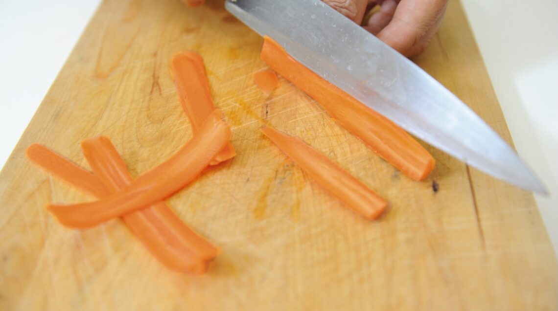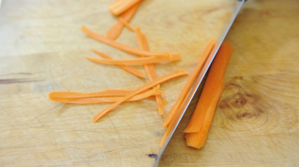 Per inserire le carote nel ripieno di un involtino così come per sgranocchiarle crude potrete ridurle a bastoncini più o meno lunghi e sottili dopo averle prima tagliate a fette usando un grosso coltello. Lo stesso taglio sarà adatto, quanto le rondelle più spesse, per la cottura in forno o a vapore.