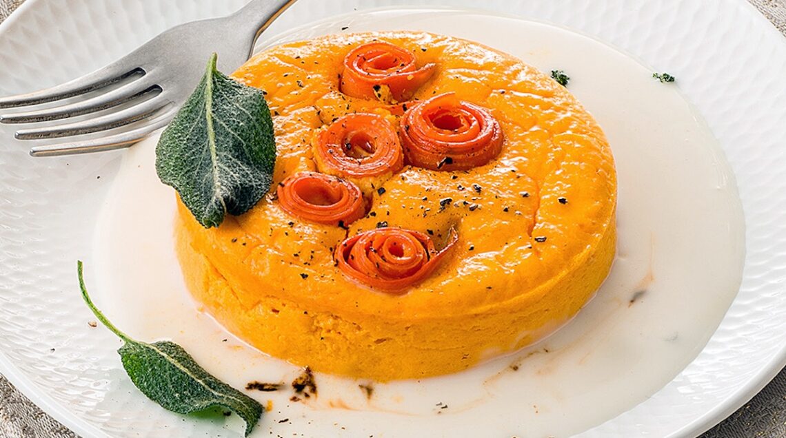 Passando ai piatti che vedono le carote protagoniste assolute troviamo sia antipasti sia contorni. Oppure in entrambi. Le carote e mandorle in agrodolce, per esempio, sono una conserva da servire sia in apertura di pasto sia come accompagnamento di un secondo piatto, mentre il flan di carote su crema di formaggio (foto sopra) potrà essere proposto anche come raffinato secondo vegetariano. La padellata di carote e mela si presenta in compenso senza ambiguità come un contorno rustico e gustoso, reso sfizioso dall’aroma della cannella e dalla dolcezza dello zucchero di canna. Facilissime da preparare e sempre profumate dalle spezie sono anche le carote al latte e cannella, cotte a lungo in padella in modo da assorbire tutto il liquido e gli aromi aggiunti.
