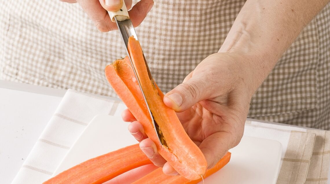 Una volta pulite e lavate, le carote più giovani potranno essere lasciate intere o tagliate seguendo la ricetta scelta. Se invece sono grosse e già di una certa età sarà opportuno eliminarne la parte centrale dura. Per farlo, posate l’ortaggio sul tagliere e, tenendolo fermo con una mano, dividetelo a metà nel senso della lunghezza mettendo così a nudo il cuore legnoso.