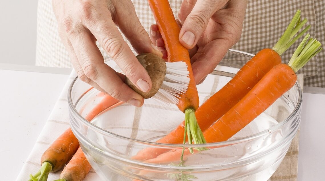 Cominciate quindi con lo sciacquare le carote sotto l’acqua fresca corrente. Per rimuovere eventuale terriccio residuo e impurità varie strofinatele bene con le mani o, se la possedete, con una apposita spazzolina a setole dure.