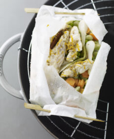 CUCINARE AL CARTOCCIO La tecnica è molto simile a quella usata per la cottura al vapore. Il cibo si racchiude in un cartoccio di carta da forno o alluminio, si versa liquido sul fondo, si copre con il coperchio e si cuoce a fuoco dolce.
