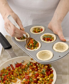 Per preparare i bicchierini salati, ricavate dalla pasta stesa tanti dischetti e foderate con questi fondo e bordi di alti stampini per muffin. Farciteli a piacere con abbondanti verdure a dadini saltate in padella e infornate per 15-20 minuti.